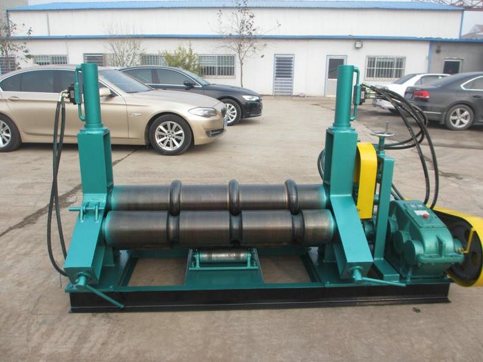 該機結構形式為三輥非對稱式。側輥在兩直列輥中間對稱位置作平衡升降運動,通過絲杠、絲母而獲得,兩直列輥作旋轉夾緊送料運動,通過減速機的輸出齒輪與下輥齒輪嚙合,實現板材的行走。當側輥輥的下壓力超過材料的屈服限度時,便使所卷制的材料變形,從而達到卷制直徑達大小: